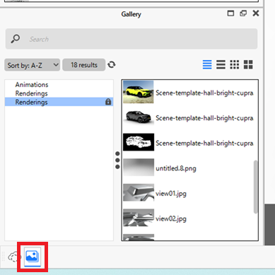 ギャラリーはツールバーからアクセスできます(画像赤枠部分)。デフォルトでは、KeyShotリソースディレクトリ内の「Renderings」および「Animations」サブフォルダにある作品がギャラリーに表示されます。設定から、ギャラリーにカスタム出力フォルダを追加することも可能です。